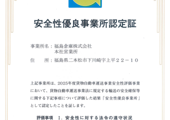 2025年12月16日安全性優良事業所認定証(Gマーク)の更新審査にて「安全性優良事業所」として認定されました。